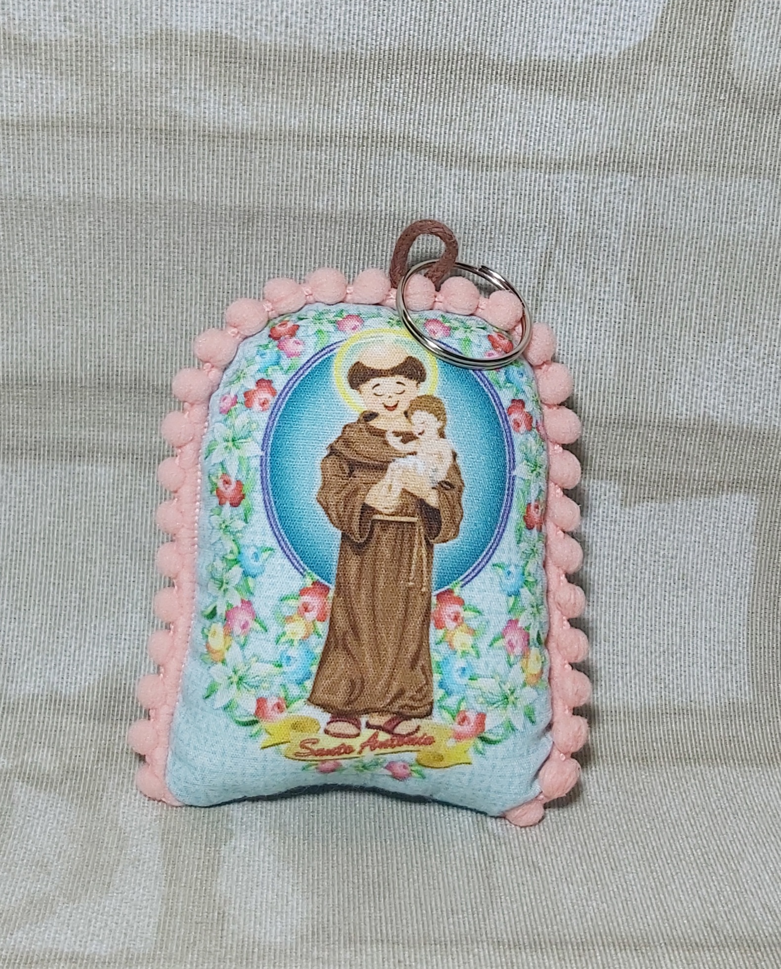 Estampa do Santinho na frente e atrás tecido estampado fundo azul.