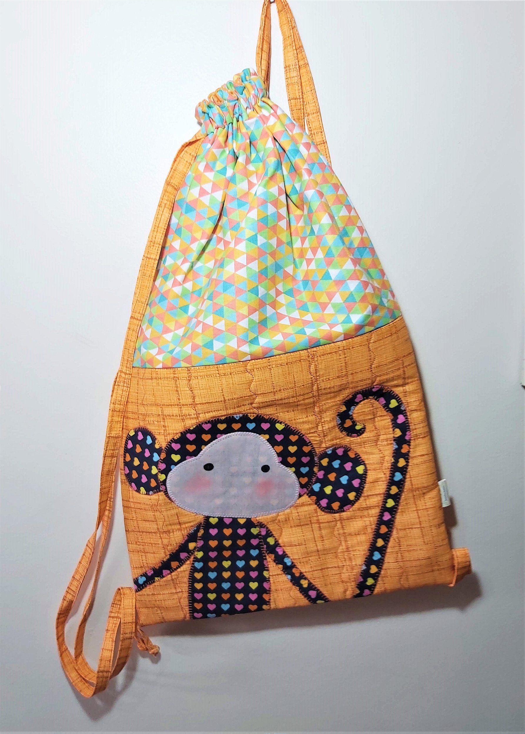 Mochila Macaco Feliz feita em tecido tricoline 100% algodão, com forro também em tricoline, com aplicação em tricoline e base reforçada com manta acrilica. A mochila é ampla e serve para carregar pertences e brinquedos trazendo independência e liberdade para a criança.