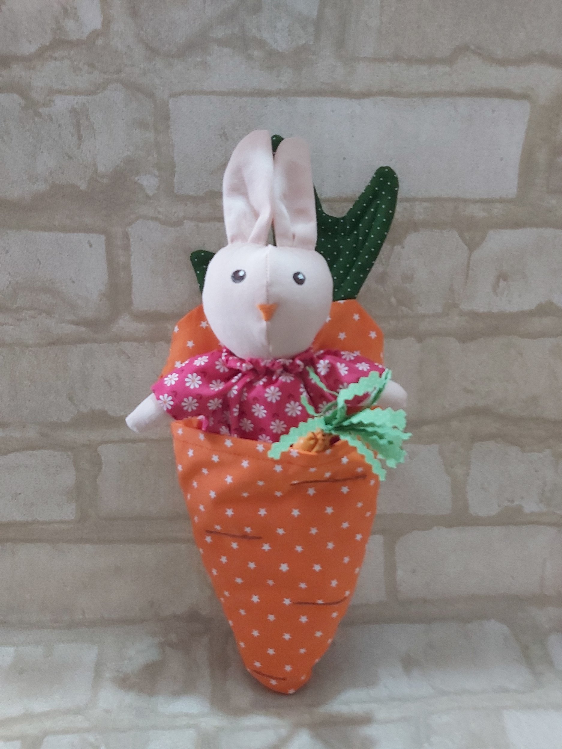 Este lindo kit é composto por 1 coelho vestido em seu lindo macacão, uma minicenourinha e uma cenoura maior que é a cama do coelho, tudo confeccionado em tecido tricoline 100% algodão, enchimento em fibra siliconada antialérgica, olhinhos pintados com tinta de tecido e nariz bordado.