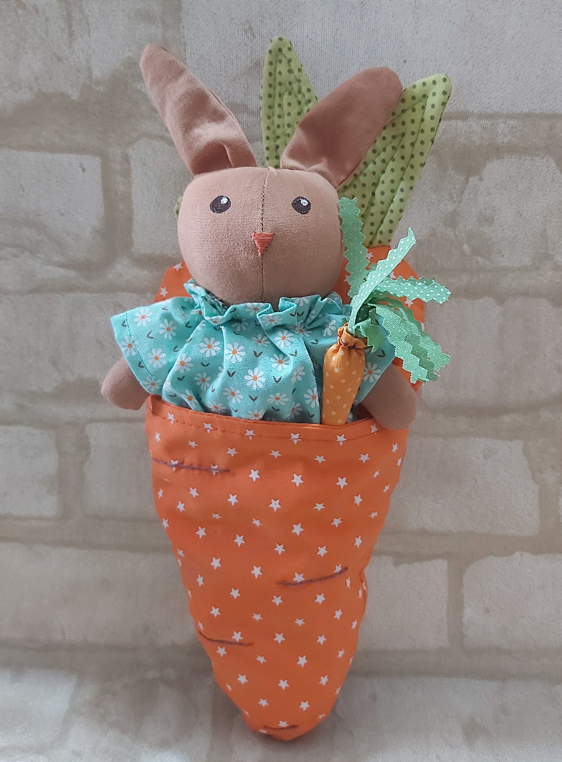 Este lindo kit é composto por 1 coelho vestido em seu lindo macacão, uma minicenourinha e uma cenoura maior que é a cama do coelho, tudo confeccionado em tecido tricoline 100% algodão, enchimento em fibra siliconada antialérgica, olhinhos pintados com tinta de tecido e nariz bordado.